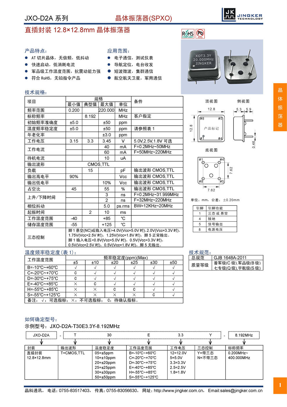 产品特点:AT切片晶体,无倍频,低抖动;快速启动,低消耗电流;军品级工作温度范围,抗震动能力强;符合RoHS,无铅指令产品。应用范围:电子通信,测试仪表;导航定位,电台收发;短波微波,集群通信;航空航天卫星,军用通信。