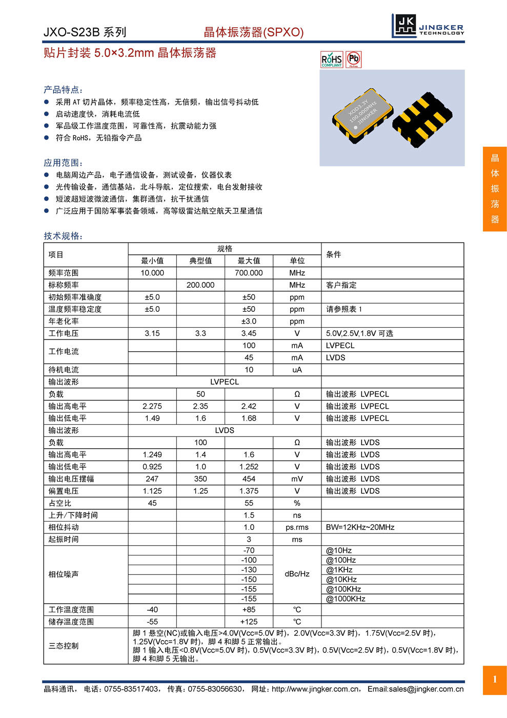 产品特点:AT切片晶体,无倍频,低抖动;快速启动,低消耗电流;军品级工作温度范围,抗震动能力强;符合RoHS,无铅指令产品。应用范围:电子通信,测试仪表;导航定位,电台收发;短波微波,集群通信;航空航天卫星,军用通信。