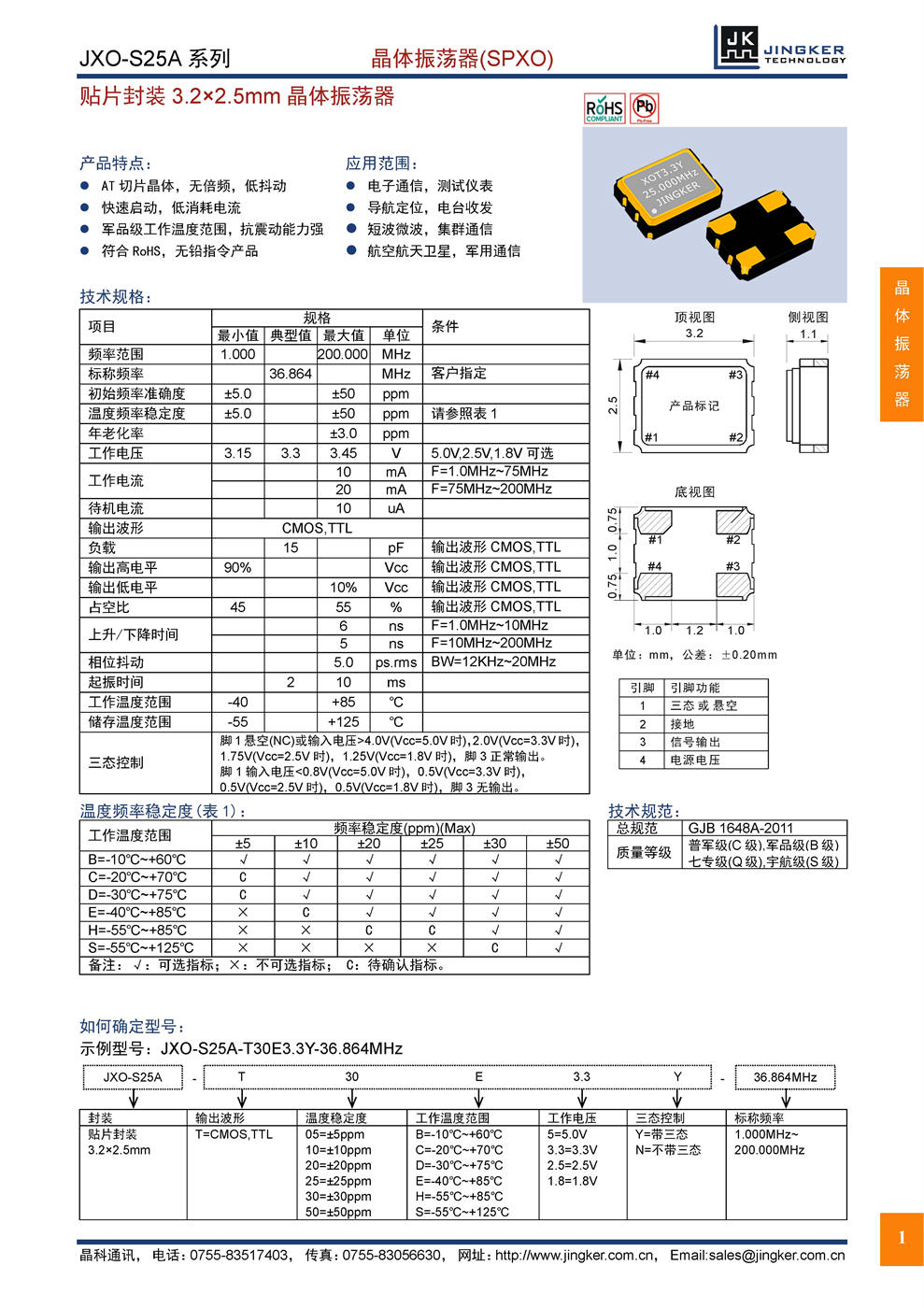 产品特点:AT切片晶体,无倍频,低抖动;快速启动,低消耗电流;军品级工作温度范围,抗震动能力强;符合RoHS,无铅指令产品。应用范围:电子通信,测试仪表;导航定位,电台收发;短波微波,集群通信;航空航天卫星,军用通信。