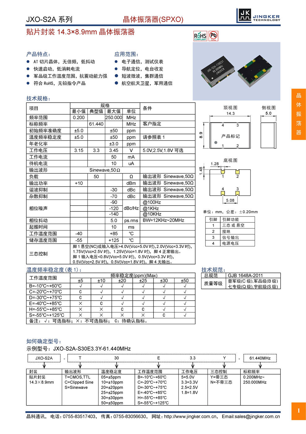 产品特点:AT切片晶体,无倍频,低抖动;快速启动,低消耗电流;军品级工作温度范围,抗震动能力强;符合RoHS,无铅指令产品。应用范围:电子通信,测试仪表;导航定位,电台收发;短波微波,集群通信;航空航天卫星,军用通信。