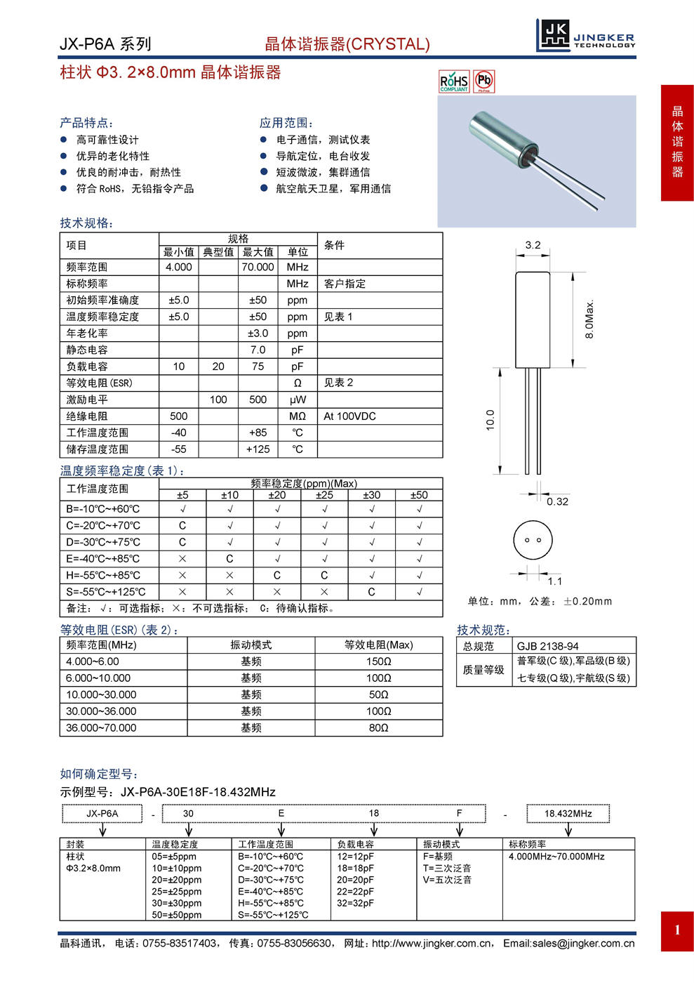 产品特点:高可靠性设计;优异的老化特性;优良的耐冲击,耐热性;符合RoHS,无铅指令产品。应用范围:电子通信,测试仪表;导航定位,电台收发;短波微波,集群通信;航空航天卫星,军用通信。