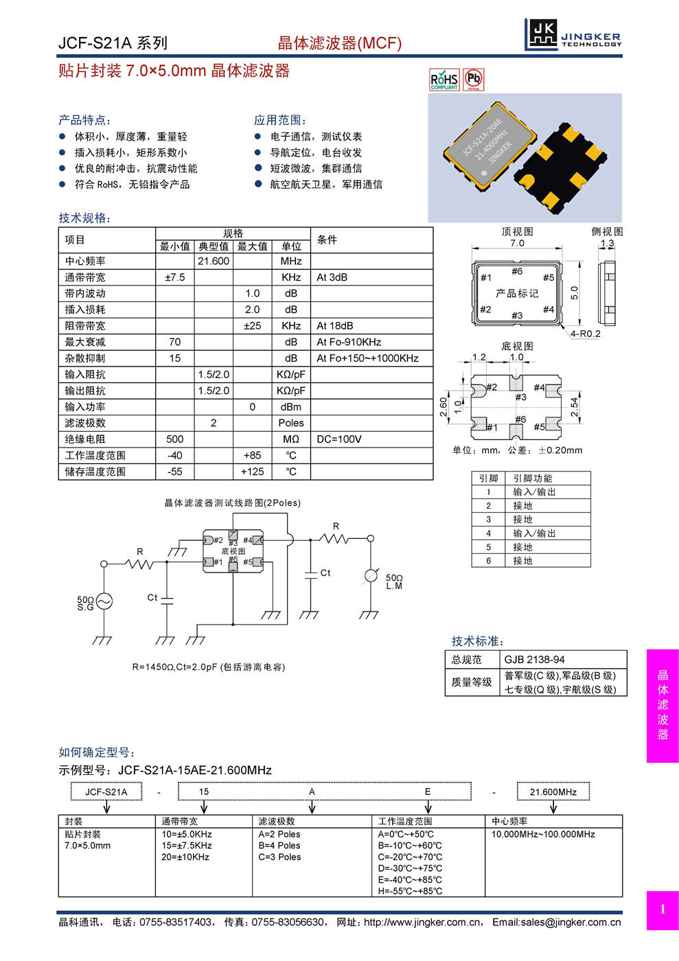 产品特点:体积小,厚度薄,重量轻;插入损耗小,矩形系数小;优良的耐冲击,抗震动性能;符合RoHS,无铅指令产品。应用范围:电子通信,测试仪表;导航定位,电台收发;短波微波,集群通信;航空航天卫星,军用通信。