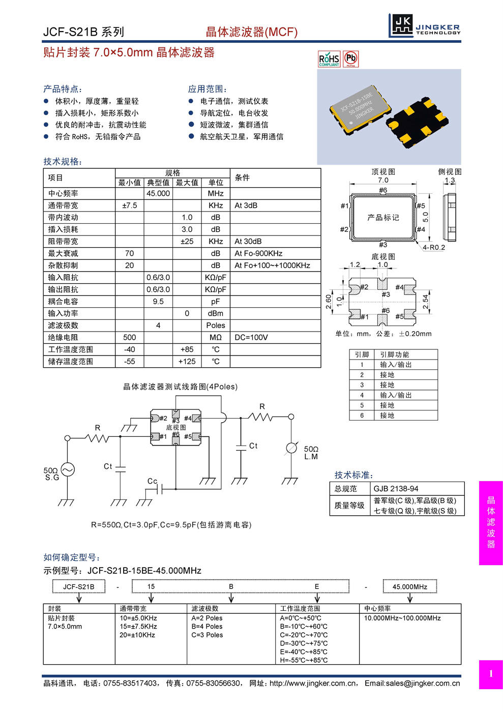 产品特点:体积小,厚度薄,重量轻;插入损耗小,矩形系数小;优良的耐冲击,抗震动性能;符合RoHS,无铅指令产品。应用范围:电子通信,测试仪表;导航定位,电台收发;短波微波,集群通信;航空航天卫星,军用通信。