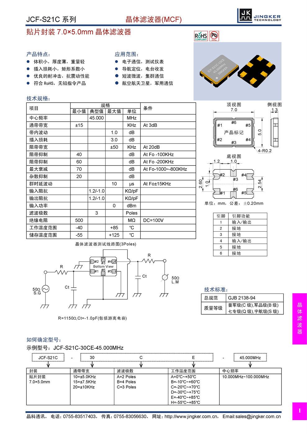 产品特点:体积小,厚度薄,重量轻;插入损耗小,矩形系数小;优良的耐冲击,抗震动性能;符合RoHS,无铅指令产品。应用范围:电子通信,测试仪表;导航定位,电台收发;短波微波,集群通信;航空航天卫星,军用通信。