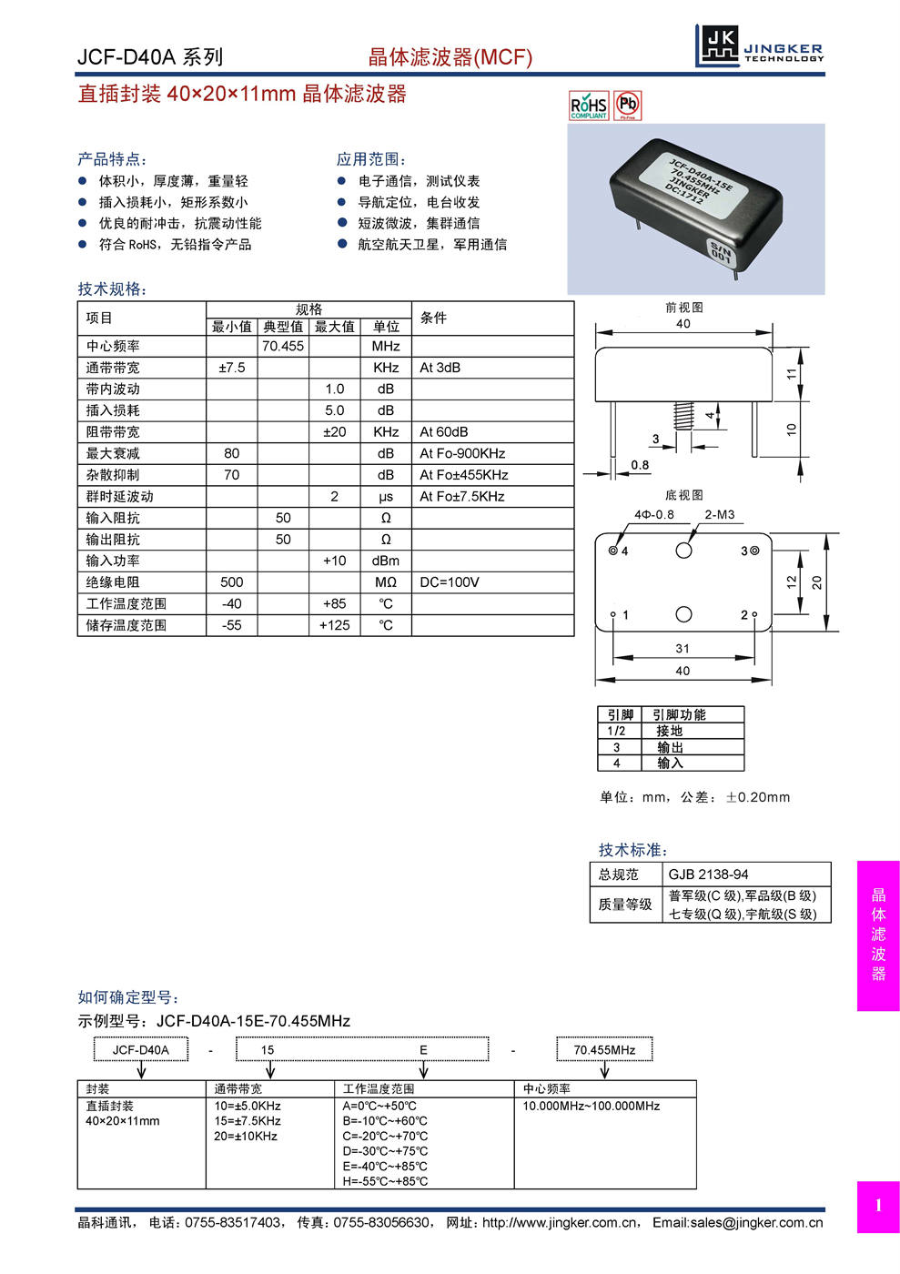 产品特点:体积小,厚度薄,重量轻;插入损耗小,矩形系数小;优良的耐冲击,抗震动性能;符合RoHS,无铅指令产品。应用范围:电子通信,测试仪表;导航定位,电台收发;短波微波,集群通信;航空航天卫星,军用通信。