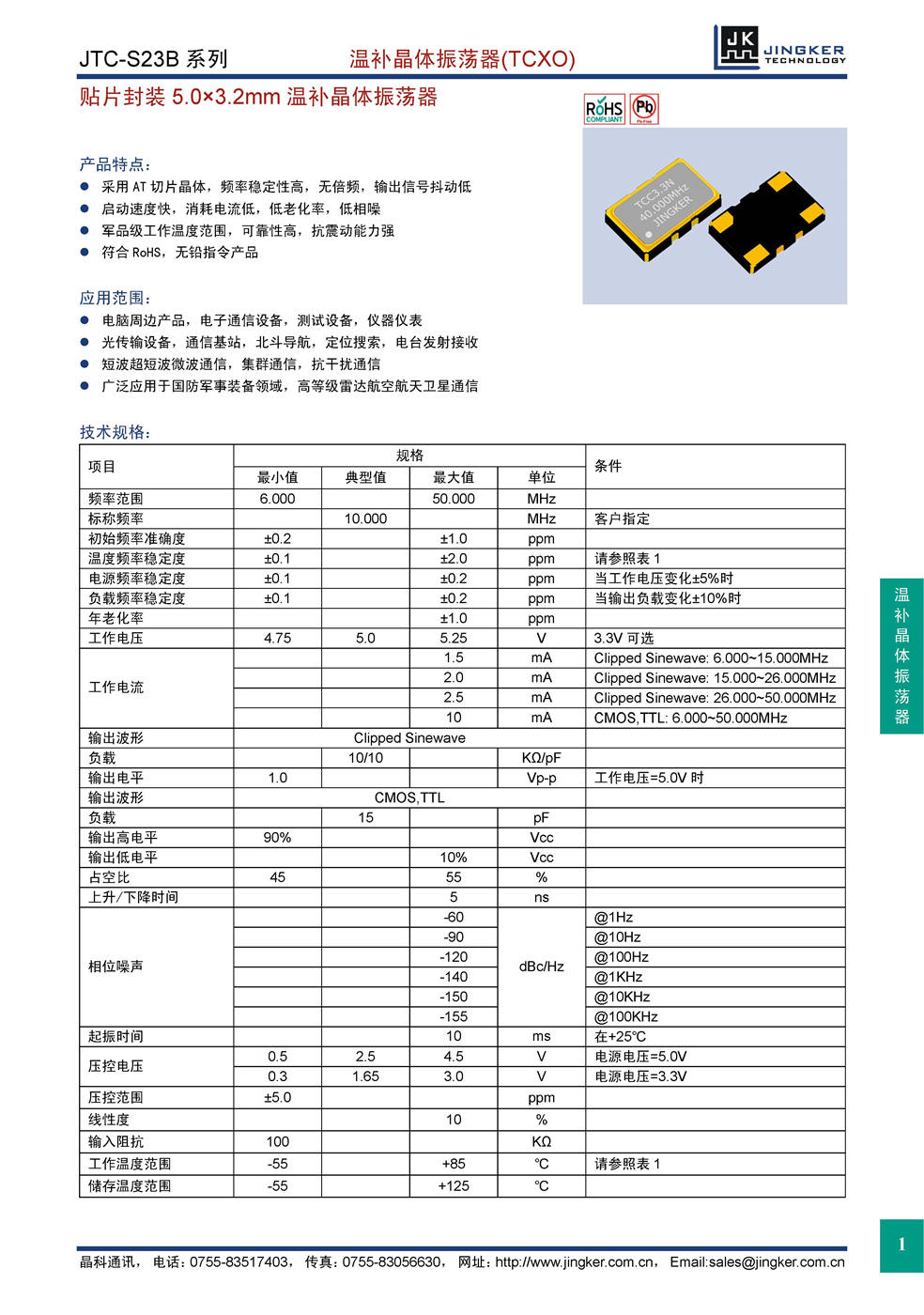产品特点:采用AT切片晶体,频率稳定性高,无倍频,输出信号抖动低;启动速度快,消耗电流低,低老化率,低相噪;军品级工作温度范围,可靠性高,抗震动能力强;符合RoHS,无铅指令产品。应用范围:电脑周边产品,电子通信设备,测试设备,仪器仪表;光传输设备,通信基站,北斗导航,定位搜索,电台发射接收;短波超短波微波通信,集群通信,抗干扰通信;广泛应用于国防军事装备领域,高等级雷达航空航天卫星通信。