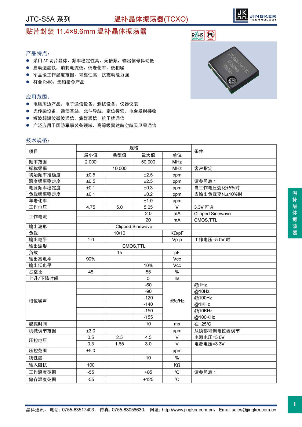 产品特点:采用AT切片晶体,频率稳定性高,无倍频,输出信号抖动低;启动速度快,消耗电流低,低老化率,低相噪;军品级工作温度范围,可靠性高,抗震动能力强;符合RoHS,无铅指令产品。应用范围:电脑周边产品,电子通信设备,测试设备,仪器仪表;光传输设备,通信基站,北斗导航,定位搜索,电台发射接收;短波超短波微波通信,集群通信,抗干扰通信;广泛应用于国防军事装备领域,高等级雷达航空航天卫星通信。
