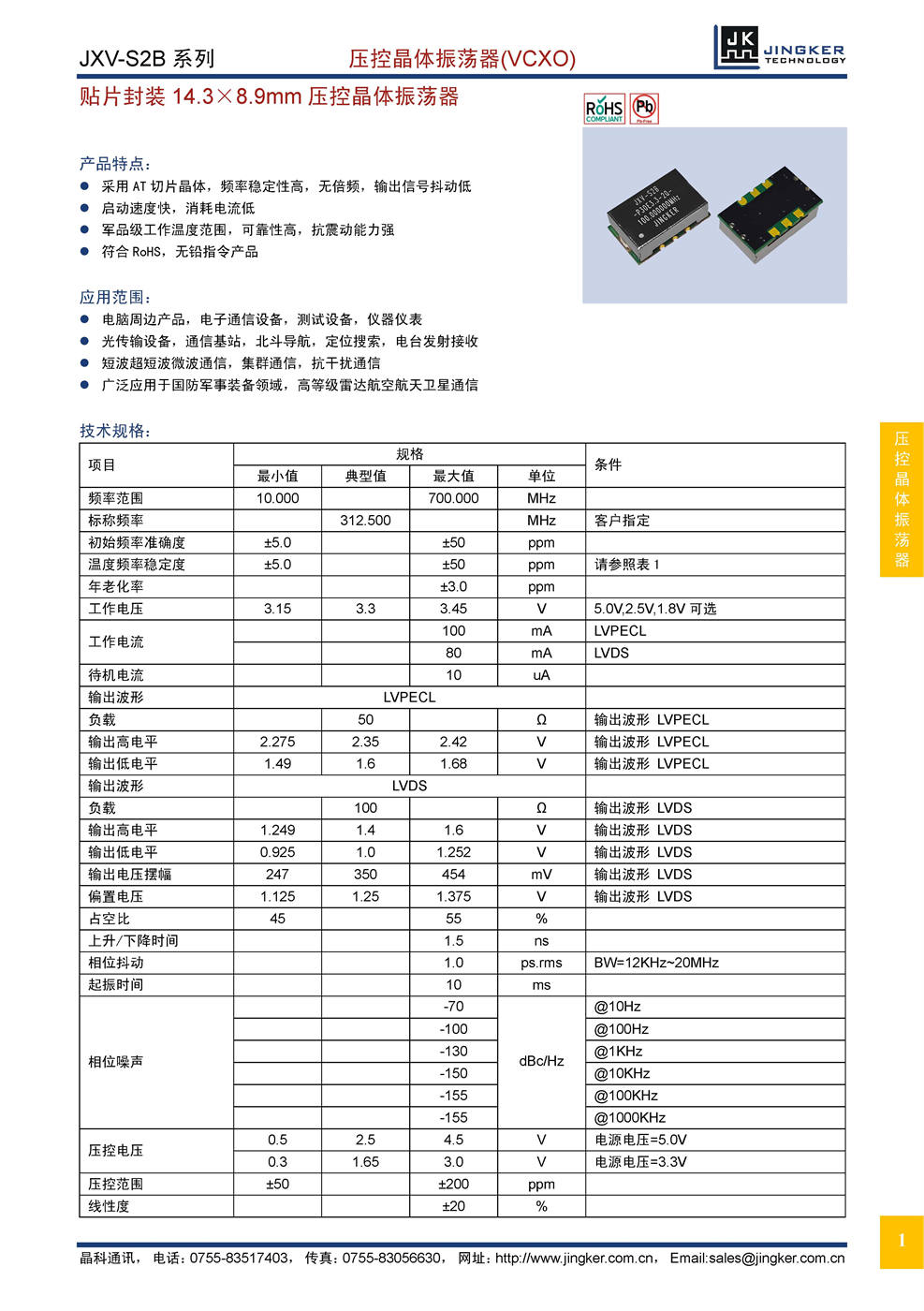 产品特点:采用AT切片晶体,频率稳定性高,无倍频,输出信号抖动低;启动速度快,消耗电流低;军品级工作温度范围,可靠性高,抗震动能力强;符合RoHS,无铅指令产品。应用范围:电脑周边产品,电子通信设备,测试设备,仪器仪表;光传输设备,通信基站,北斗导航,定位搜索,电台发射接收;短波超短波微波通信,集群通信,抗干扰通信;广泛应用于国防军事装备领域,高等级雷达航空航天卫星通信。